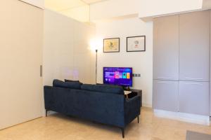 The accommodation comprises one bedroom with a bed, a living room furnished with a sofa and flat-screen TV, as well as an equipped full kitchen for preparing meals. The bathroom features both a bathtub and shower along with complimentary toiletries including shampoo, conditioner, body soap, and a hairdryer.