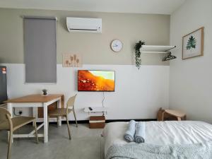 A full kitchen equipped with a microwave, refrigerator, electric kettle and dining table enables self-catering options during your stay. Entertainment comes via a flat-screen TV alongside bedside sockets for charging devices while complimentary WiFi covers all areas of the property. Additional amenities include free on-site parking as well as wellness features like a private sauna inside the apartment and access to an outdoor swimming pool.