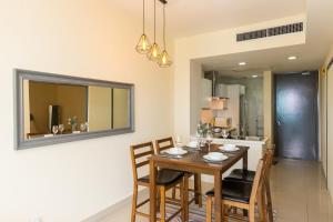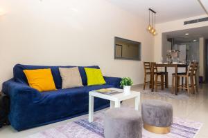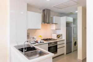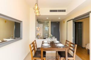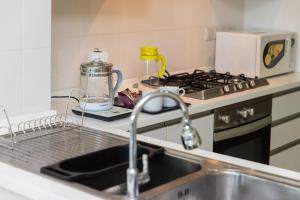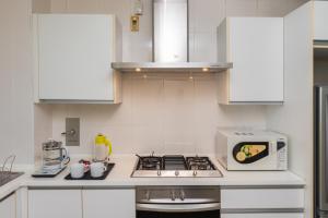 Accommodation comprises one bedroom with one bed, complemented by a full kitchen equipped with a refrigerator, oven, microwave, electric kettle, tea and coffee making facilities as well as a dining table. The living area features a seating area including a sofa and work desk along with ironing facilities such as an iron and ironing board. Additional conveniences include air conditioning, towels, washing machine, clothes drying rack, chocolates or cookies provided upon arrival.