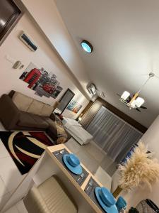 This spacious air-conditioned apartment offers one bedroom with a non-feather synthetic pillow, wardrobe, dressing room, and carpeted floors. It includes a full kitchen equipped with a microwave, refrigerator, kitchenware, kitchenette area, and dining table. The living space features a sofa seating area as well as tile/marble flooring.