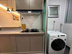 The air-conditioned apartment comprises two separate bedrooms along with two bathrooms including a private bathroom and an additional shared bathroom outside the room. Guests can prepare meals in the fully equipped kitchen while benefiting from in-room amenities such as a washing machine.