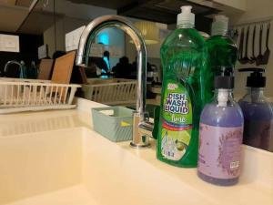 Accommodation consists of one living room alongside two bedrooms that include three beds and one futon to accommodate guests comfortably. There are two bathrooms equipped with both a bathtub and shower as well as essential amenities such as bidet, hairdryer, shampoo, conditioner, towels, toilet facilities, and private bathrooms for added convenience.