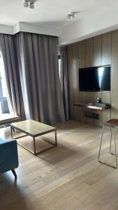 The apartment comprises two bedrooms furnished with three beds in total alongside a living room. Guests will appreciate an equipped kitchen featuring a stovetop, refrigerator, dishwasher, oven, microwave, toaster, electric kettle, minibar and full kitchenware including a coffee machine. Additional conveniences include an ironing board with iron, wardrobe/closet space, soundproofed rooms with hardwood or parquet flooring plus individually controlled air conditioning.