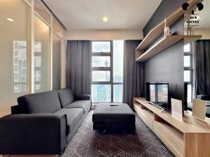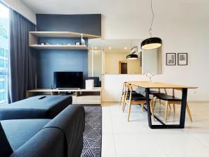 The apartment featured a stylish design with spacious, clean rooms and large windows offering stunning city night views. Located in the heart of Bukit Bintang, it provided easy walking access to shopping malls, food streets, and MRT stations. Convenience stores and dining options were available just downstairs. The building included amenities such as a pool and gym. From the pool area, Merdeka 118 was visible on the skyline.